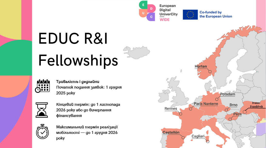 Карпатський національний університет імені Василя Стефаника запрошує викладачів та аспірантів університету подати заявку на участь у новому європейському конкурсі EDUC Research & Innovation Fellowships, який фінансується Європейським Союзом у межах проєкту EDUC-WIDE.